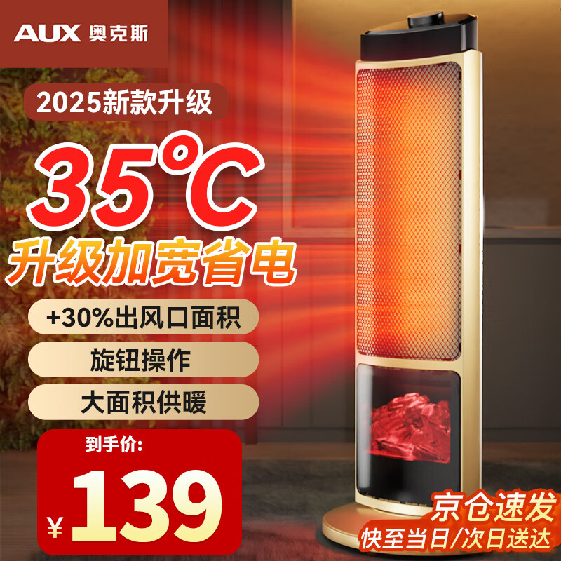 奥克斯(AUX)取暖器家用暖风机ECO节能火焰特效立式取暖器电暖风浴室热风机电暖气速热电暖器卧室烤火炉 【ECO省电王+加宽机身】机械款