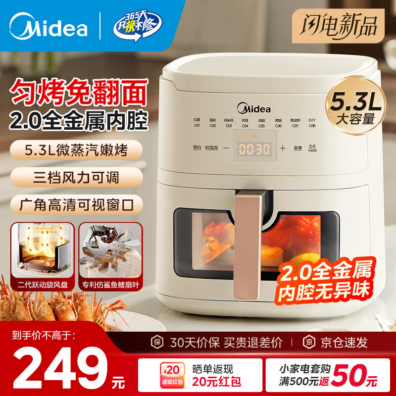 美的(Midea)空气炸锅大容量免翻面家用多功能电炸锅智能定时无油低脂煎炸锅炸鸡薯机条可视蒸烤一体空气烤箱 KZC5383D【三档风力可调】免翻面 5.3L