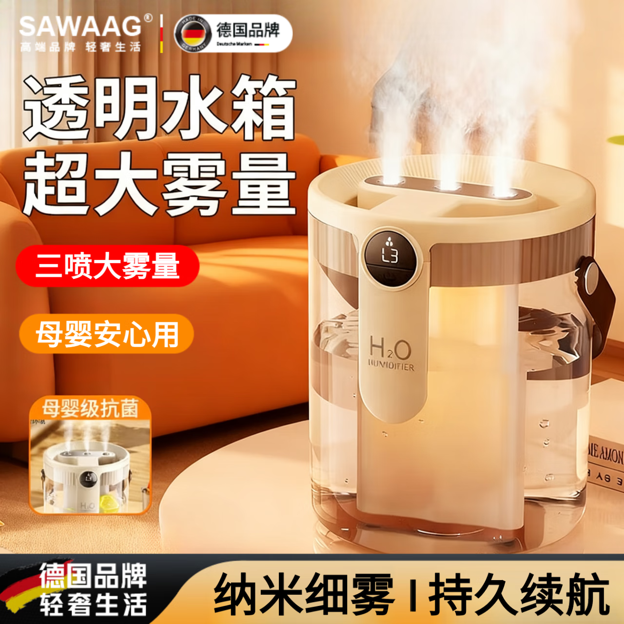 飒望德国2025新款加湿器小型三喷大雾量办公室桌面迷你家用卧室空调房孕妇婴儿车载静音容量补水保湿器 插线款【米色·透明水箱】双喷大雾+UVC杀菌 三喷大雾量+温馨夜灯