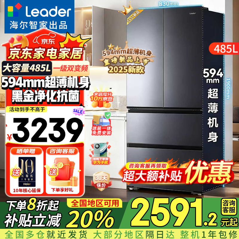 海尔智家冰箱485升法式多门四开门594mm超薄机身一级能效双变频风冷无霜大容量家用电冰箱Leader系列 594mm超薄+黑金净化+三档变温+一级双变频