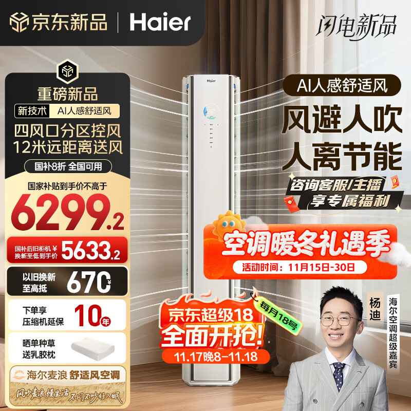 海尔(Haier)麦浪舒适风空调 3匹柜机AI人感防直吹 客厅柜机 一级能效节能空调KFR-72LW/E2-1 以旧换新国家补贴