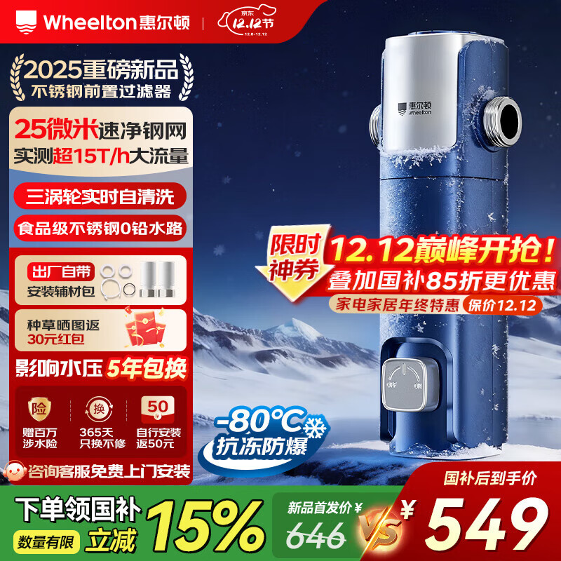 惠尔顿(WHEELTON)不锈钢前置过滤器25微米自动清洗前十名反冲洗防爆防冻全屋家用净水器15T大通量钢盾 P0038ultra 25微米不锈钢前置(免换芯)