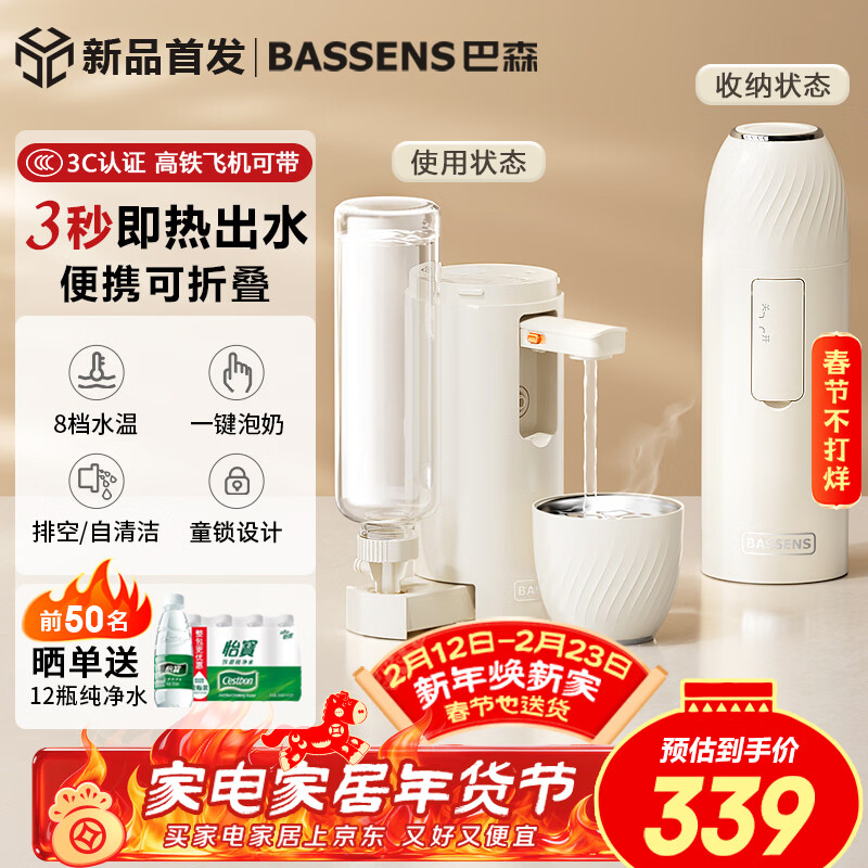 BASSENS【情人节礼物】巴森便携即热式饮水机小型家用宿舍即热烧水壶旅行冲奶泡奶速热折叠电热水壶标配款
