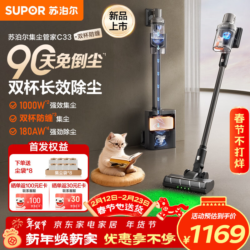 苏泊尔吸尘器自集尘基站【双杯防缠】家用手持无线大吸力集尘管家绿光除螨毛发防缠新年礼物EVS-C33-SL