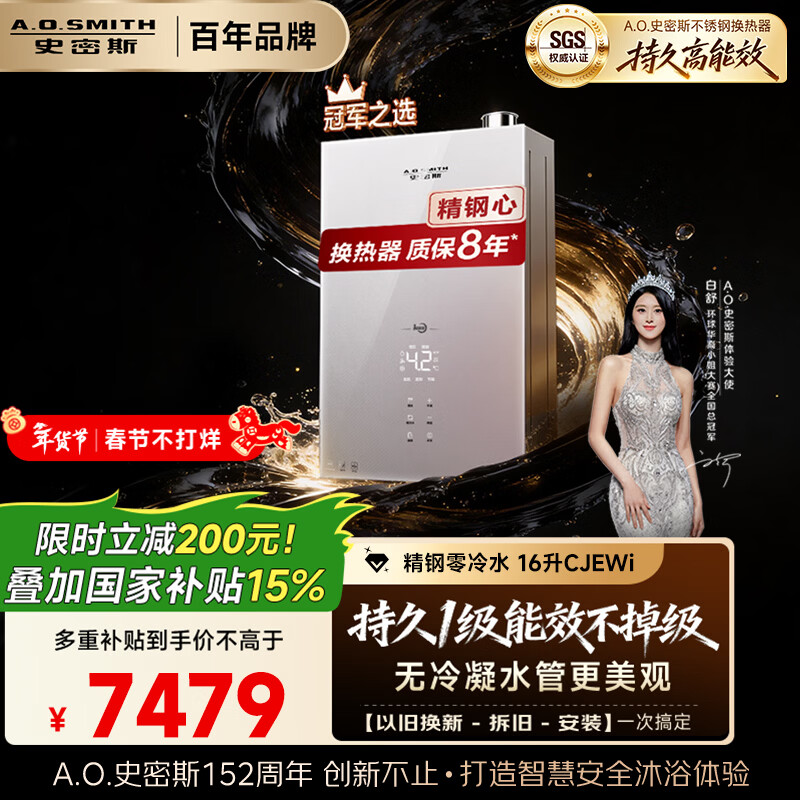 史密斯(A.O.SMITH)精钢燃气热水器 一级能效零冷水 【无冷凝水管】JSLQ28-CJEWi 国家补贴 增压大水量 新品