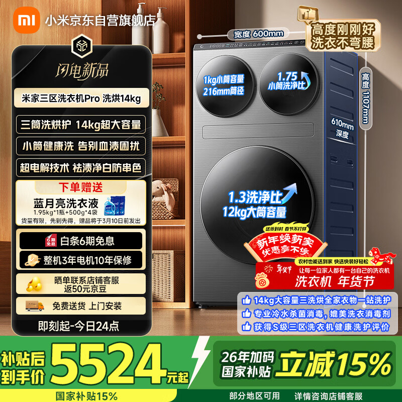 米家【超电解三洗三烘】小米洗衣机全自动滚筒三筒洗烘一体三桶儿童内衣一级能效国家补贴XHQG140MJ202