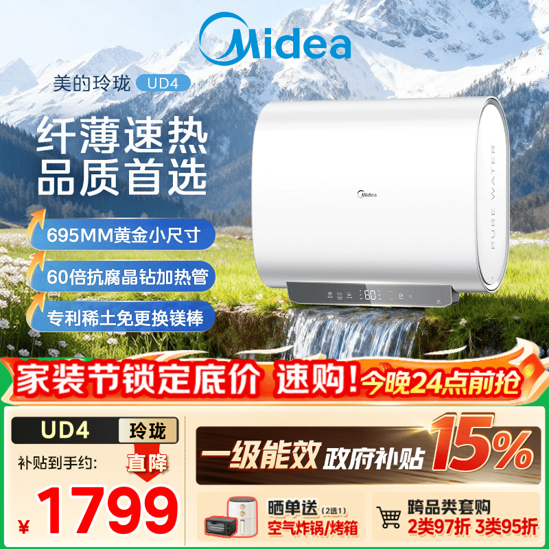 美的(Midea)【重磅新品】60升双胆扁桶电热水器3300W速热节能稀土镁棒大水量F60-33UD4(HE)一级能效国家补贴