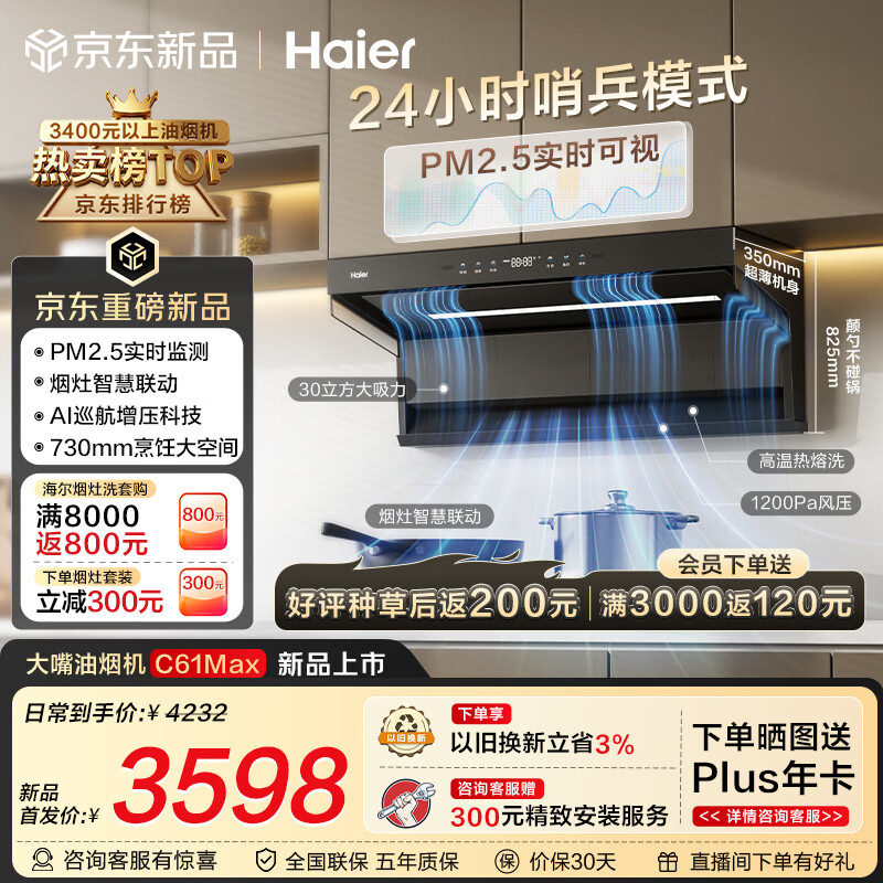海尔(Haier)抽吸排油烟机 海鲸系列C61Max+H70D顶侧双吸家用30风量大吸力 上门安装以旧换新 定时联动烟灶套装