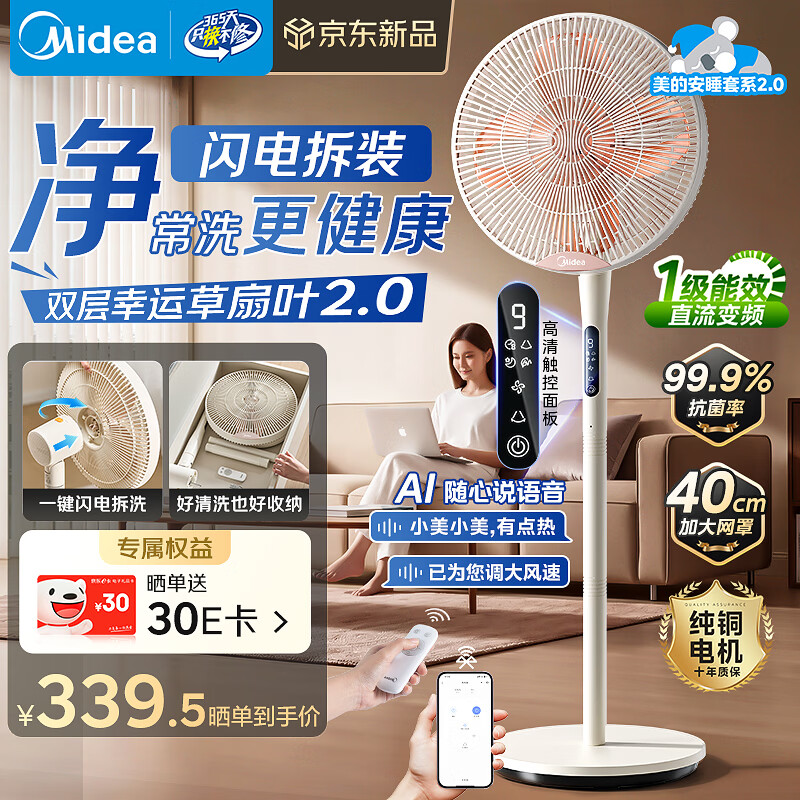 美的(Midea)【幸运草安睡2.0 MAX】一键闪装/直流变频家用轻音电风扇语音遥控落地扇 大风量一级能效卧室电扇