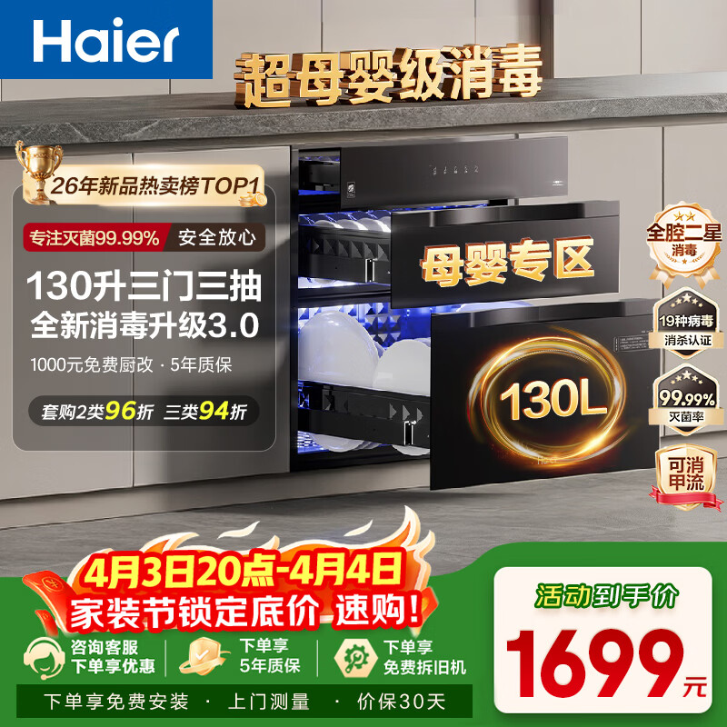海尔EB130Pro麦浪消毒柜嵌入式家用三门三抽大容量 130L消毒碗柜餐具碗筷婴儿奶瓶 光波巴氏 甲流病毒