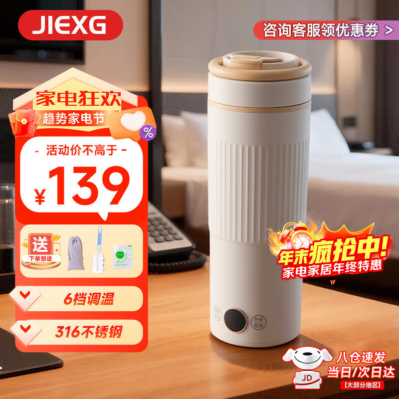 JIEXG德国便携式烧水杯 电热水杯 电热水壶 加热保温恒温水壶 600ml迷你旅行出差 0.6L 【米白色】升级六档【恒温】316不锈钢内胆