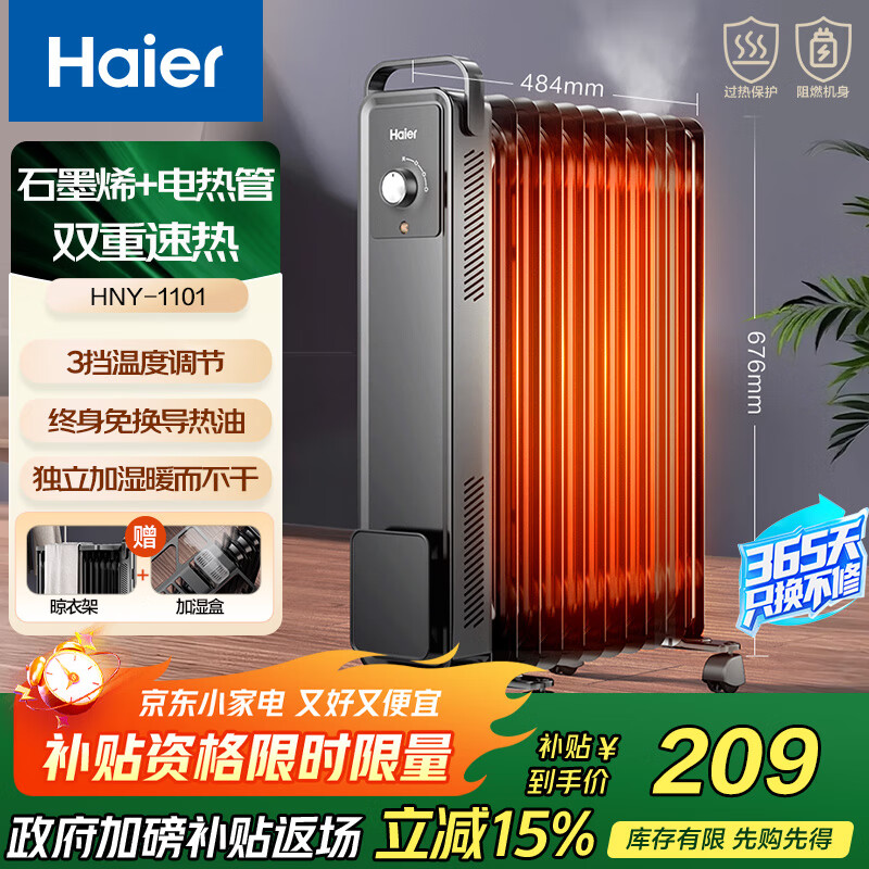 海尔(Haier)11片电热油汀取暖器 家用电暖器加湿电暖气片 全屋大面积升温速热 移动烘衣防烫烤火炉 HNY-1101