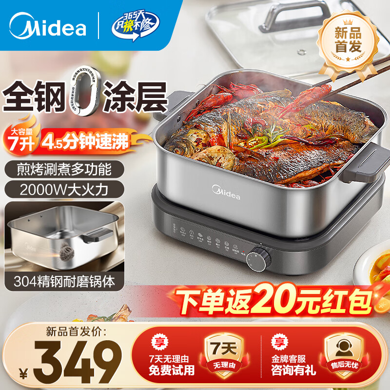 美的(Midea)全钢速沸电火锅0涂层家用7L超薄火锅专用锅不锈钢无涂层电煮锅多人涮炖煮多功能料理锅 7L MC-HGS3030G3 全钢0涂层丨4分钟速沸 304不锈钢内胆