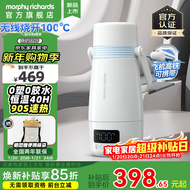 摩飞电器(Morphyrichards)电热水壶无线烧水杯便携式烧水壶全钢O塑电热水杯旅行可烧开恒温水壶保温杯婴儿调奶杯MR5605 0.5L 呼呼蓝【可无线烧开水】
