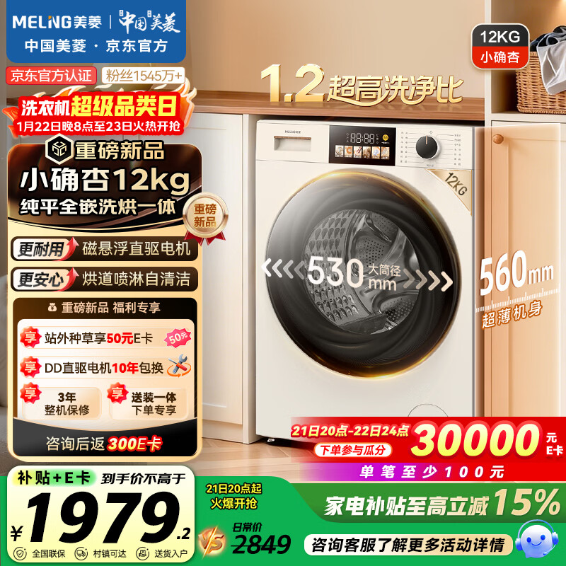 美菱(MeiLing)小确杏滚筒洗烘一体12kg超薄大筒径大容量全自动家用经济款1.2洗净比直驱变频轻音除菌螨M15H120D