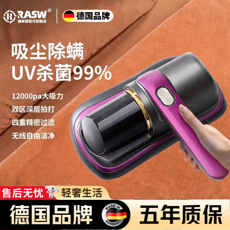 RASW【除螨神器丨紫外线杀菌】德国无线除螨仪家用床上充电手持吸尘器一体机大吸力除毛杀菌紫外线高温 【玫瑰紫】无线便携 真除螨净化 三档超高效拍打 德国品牌