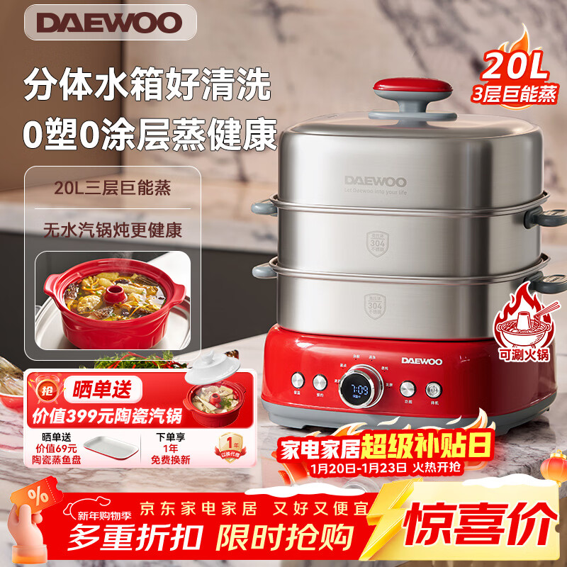 大宇(DAEWOO)【旗舰新品】电蒸锅火锅蒸炖煮一体多功能汽锅 全304不锈钢0涂层 20升3层大容量家用可拆卸 预约