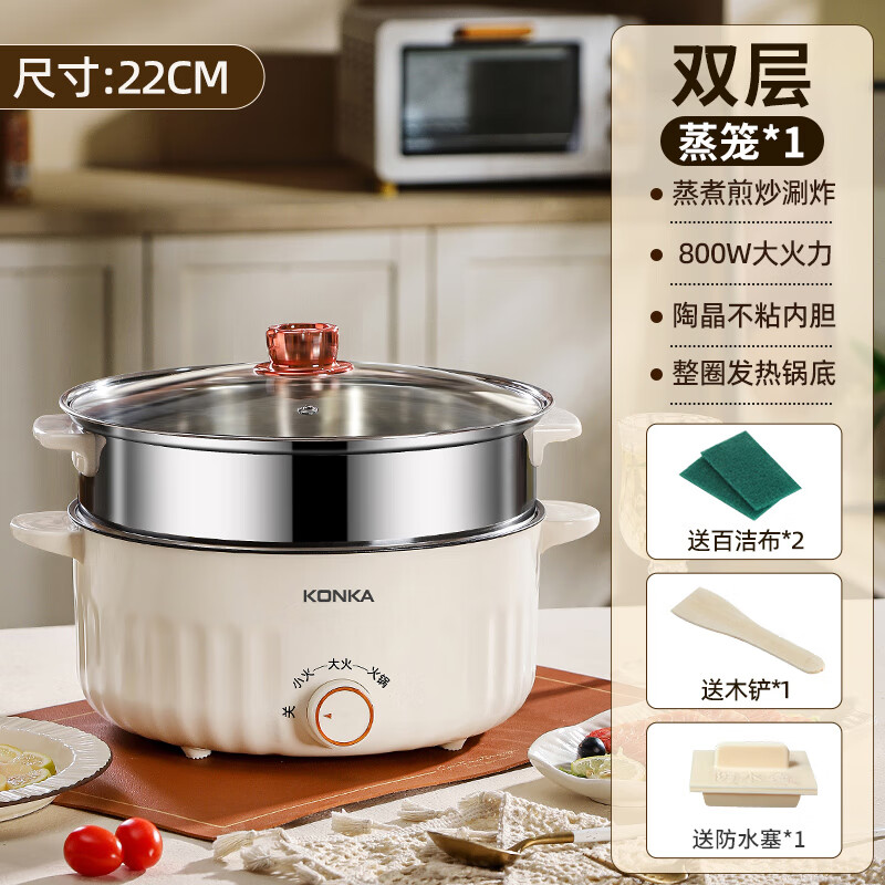 康佳(KONKA)快煮锅多功能学生宿舍锅煮面 面小锅蒸煮一体电炒菜家用电热火锅 2.5L-22CM不粘锅+蒸笼(1-2人用)