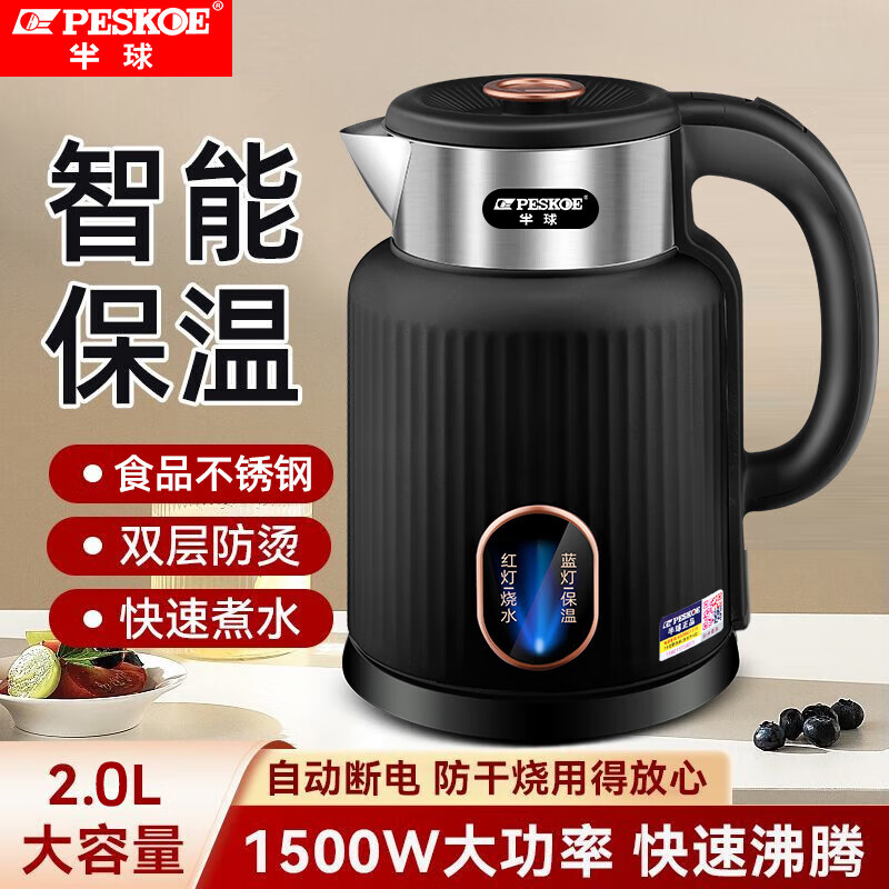 半球烧水壶不锈钢热水壶酒店宿舍电热水壶保温一体电水壶大容量家用快速壶开水壶恒温水壶 2L 【黑色+智能保温】/次日达