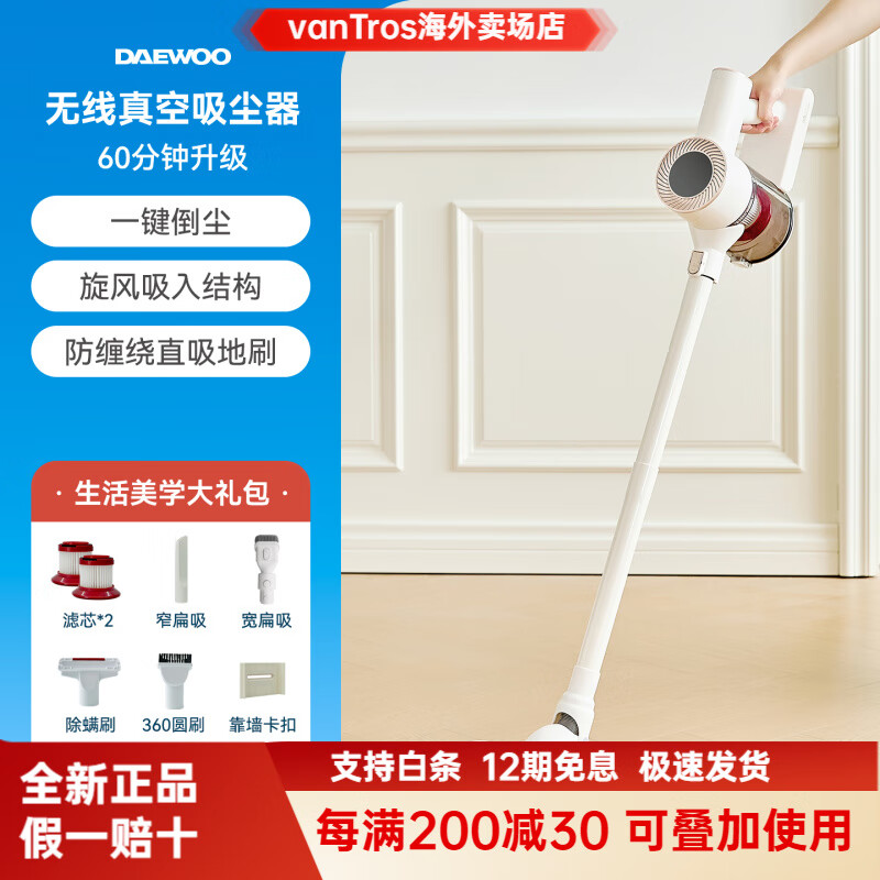 大宇(DAEWOO)无线吸尘器家用小型大吸力手持小型吸拖一体机吸猫毛 60分钟升级(芯*2+扁吸+宽毛刷+滤芯套30+3
