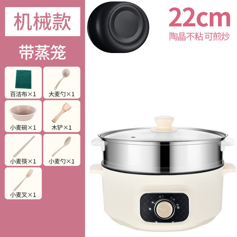小米宝宝学生电煮锅多功能家用宿舍煮面小电锅电炒菜炒锅蒸煮一体锅电火锅 卡其旋钮款22cm带蒸笼 【适合1-2人】