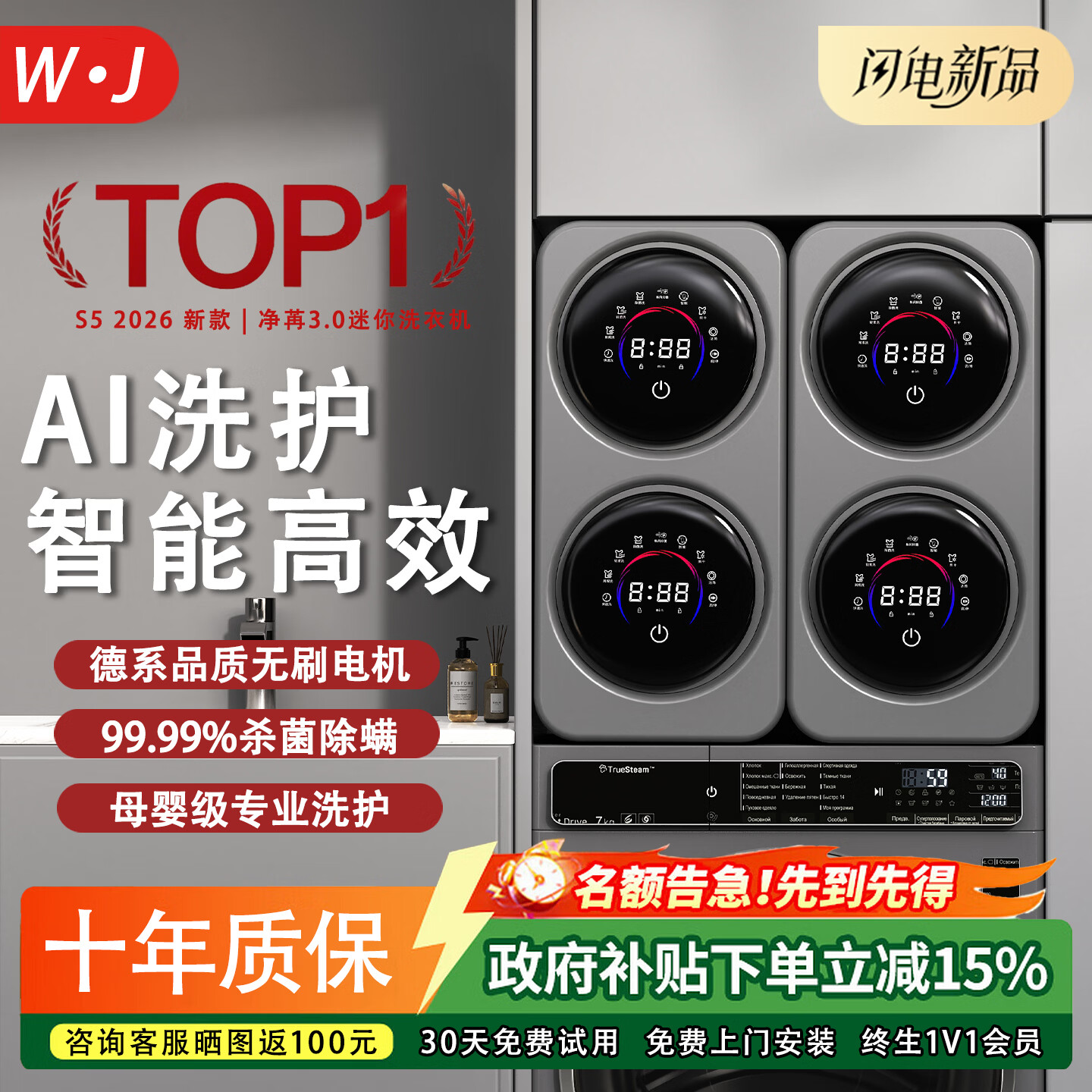 万家能【2026新品 | 内衣洗衣机 】迷你双筒全自动家用壁挂小型洗烘一体双桶除菌内裤洗袜子专用洗衣机 26年灰款【双台】四筒洗衣机 | 洗烘一体 【壁挂款】节省空间两用