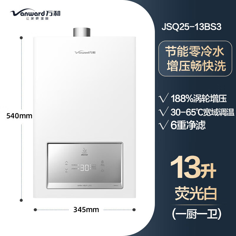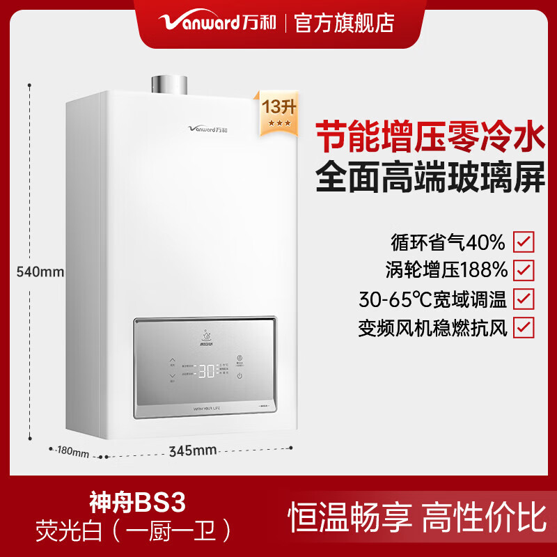 万和(Vanward)神舟家用节能增压零冷水13/16升燃气热水器BS3 JSQ25-13BS3荧光白 天然气
