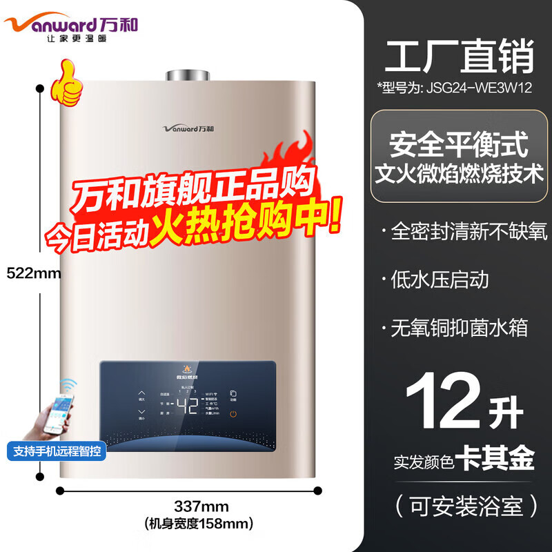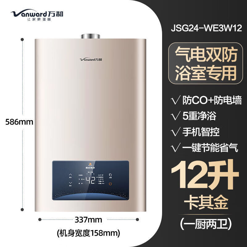 万和(Vanward)[以旧换新]12升平衡式燃气热水器气液化气可装浴室内 JSG24-WE3W12卡其金 【浴室安装/防CO 天然气