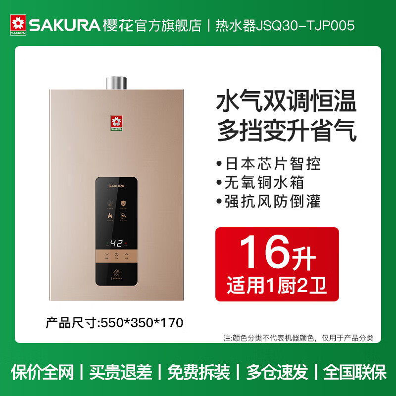 樱花(SAKURA)丨燃气热水器水气双调家用气防冻恒温16升TJP005 JSQ30-TJP005 16L金色 天然气