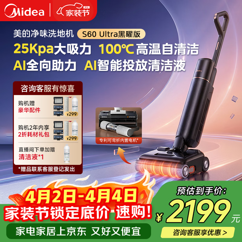 美的(Midea)【AWE同款】S60 Ultra黑曜版净味洗地机【AI全向助力 智投清洁液 】洗拖吸一体自动清洗拖地机