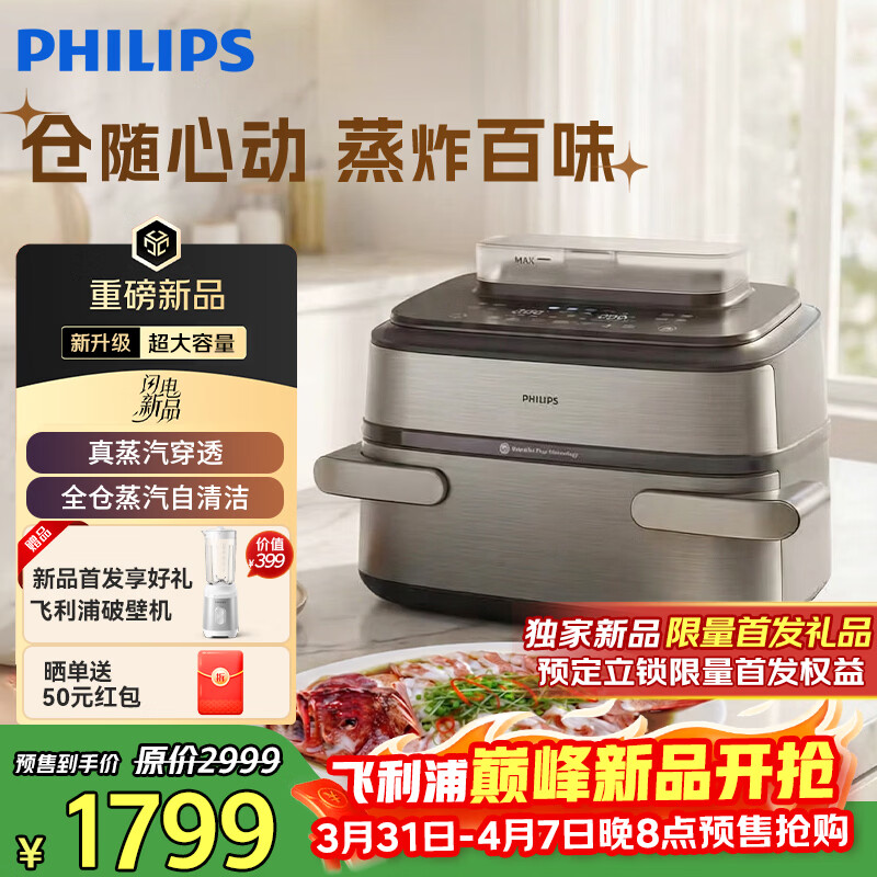 飞利浦(PHILIPS)【26年新升级】海星空气炸锅家用9.5L大容量单/双仓自由切换 蒸烤一体式真蒸汽炸 金属内腔 NA565