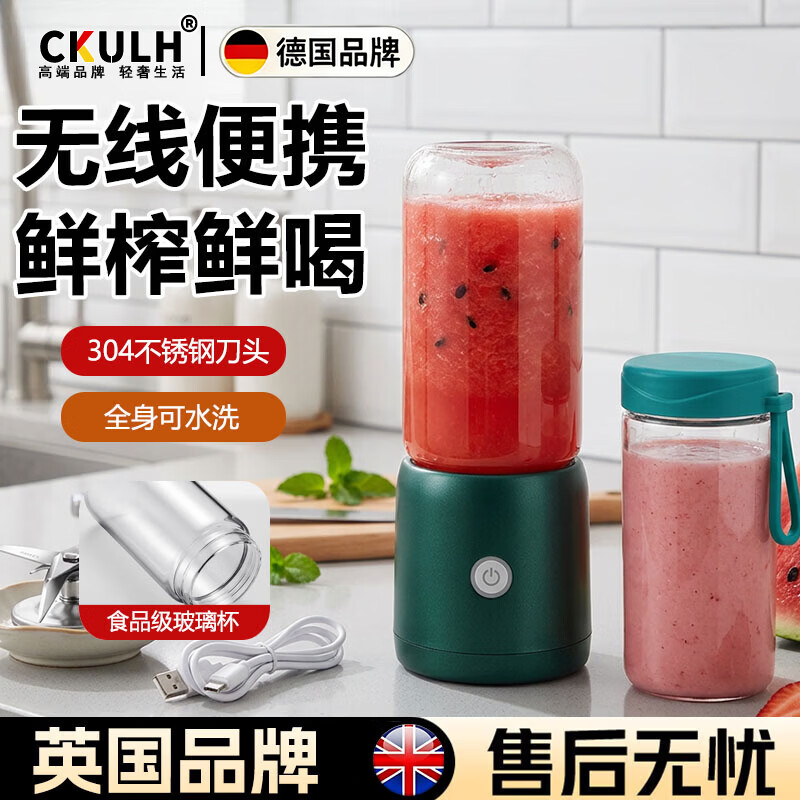 CKULH德国榨汁机小型便携式家用多功能炸果汁机全自动果蔬婴幼儿辅食机做果汁机多功能榨汁吨吨桶榨汁杯 绿色 一机二杯一盖【8叶刀】超长续航