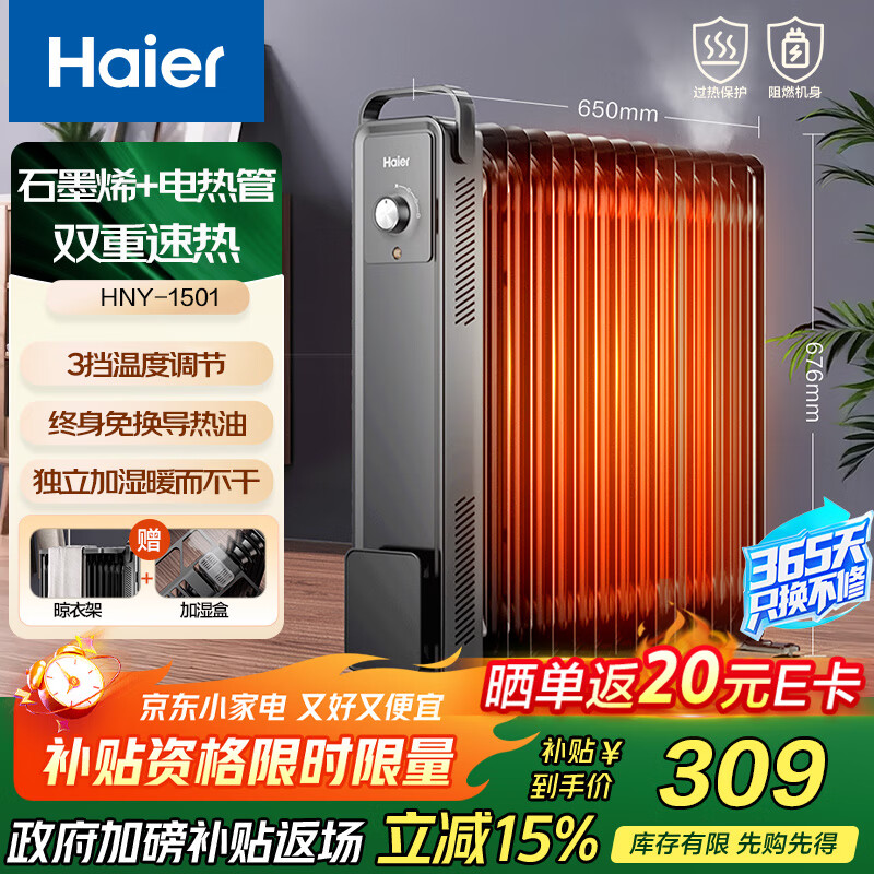 海尔(Haier)15片电热油汀 石墨烯取暖器 家用电暖器加湿电暖气片 全屋升温速热可移动烘衣防烫烤火炉 HNY-1501