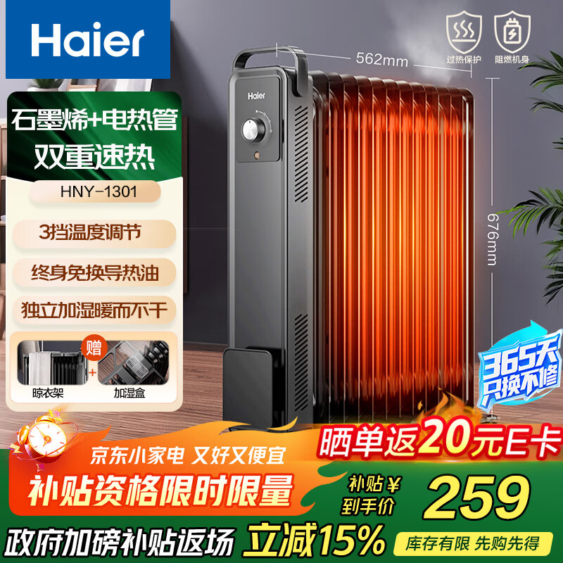 海尔(Haier)13片电热油汀 石墨烯取暖器 家用电暖器加湿电暖气片 全屋升温速热可移动烘衣防烫烤火炉 HNY-1301