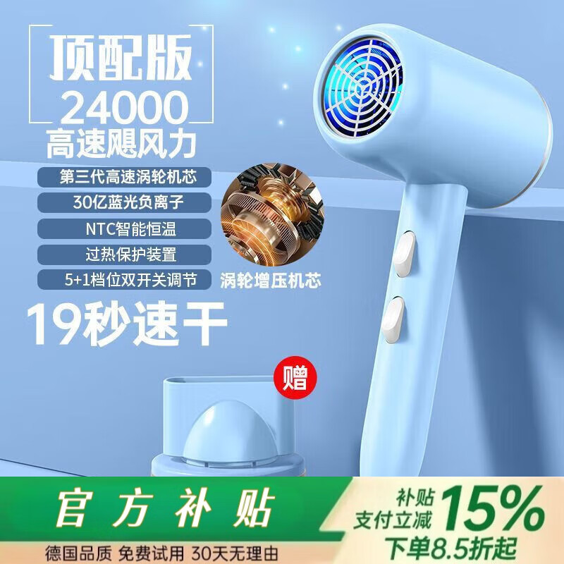 戴森德乐新款高速吹风机家用高速大功率负离子静音速干不伤发蓝光 蓝灰色高转机芯+ 体验版1200风力+无负离子