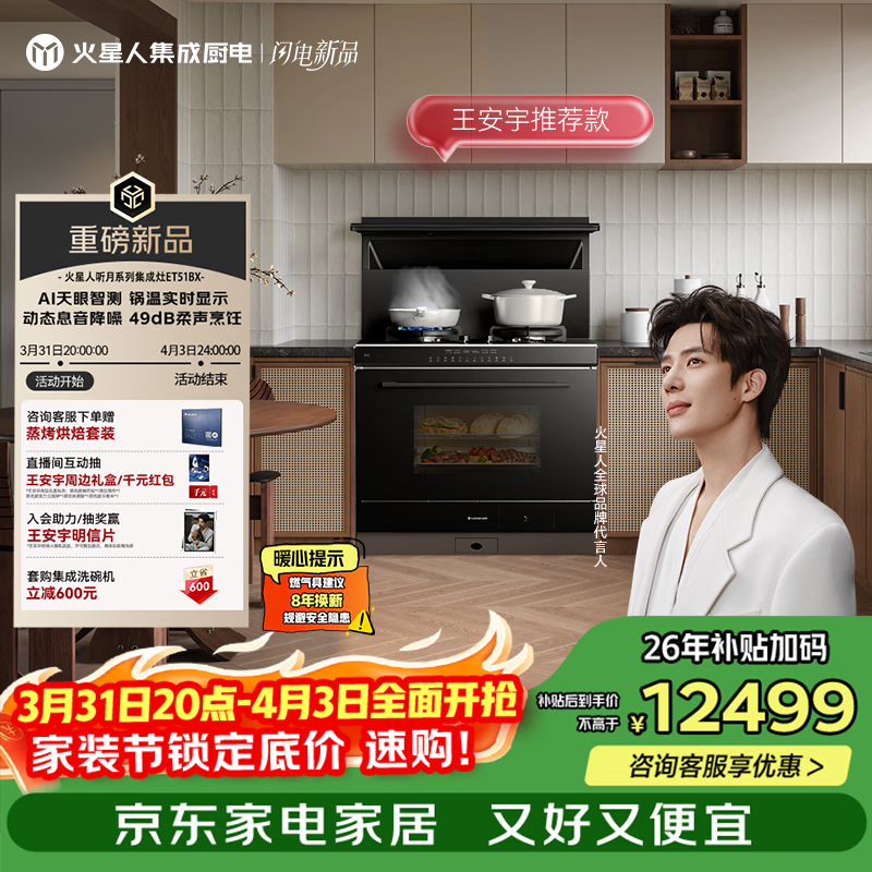 火星人【王安宇推荐款】ET51听月系列78L蒸烤消炸 变频 28风量天然气左排烟油烟机燃气灶 一体式集成灶
