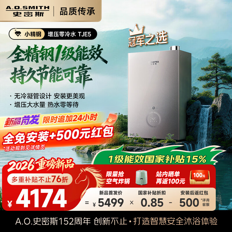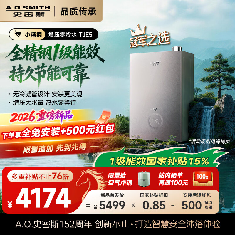 史密斯(A.O.SMITH)佳尼特 燃气热水器 一级能效零冷水【小精钢TJE5】 无冷凝水管 国家补贴 智能增压大水量 新品