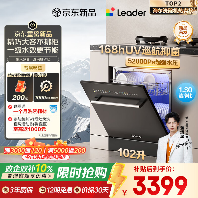 海尔(Haier)统帅懒人V1系列 家用灶下嵌入式洗碗机V1Z 102升大容量 双重除菌 智能开门速干 果蔬洗 国补自营