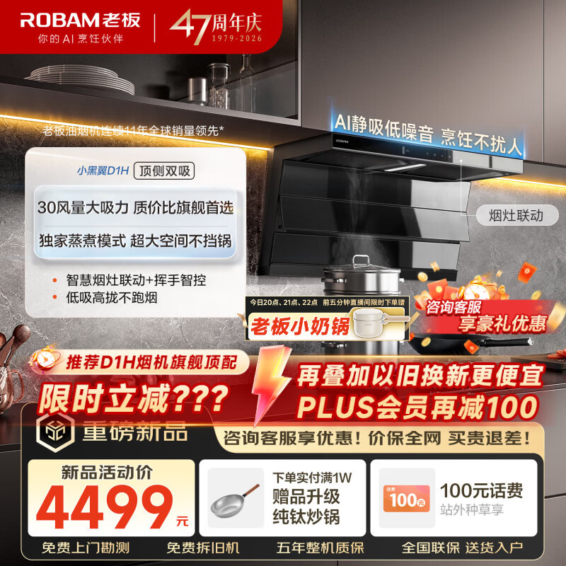 老板爆款30风量小黑翼D1H排抽吸油烟机顶侧双吸家用上门安装静音大吸力以旧换新燃气(27A2S)单烟机