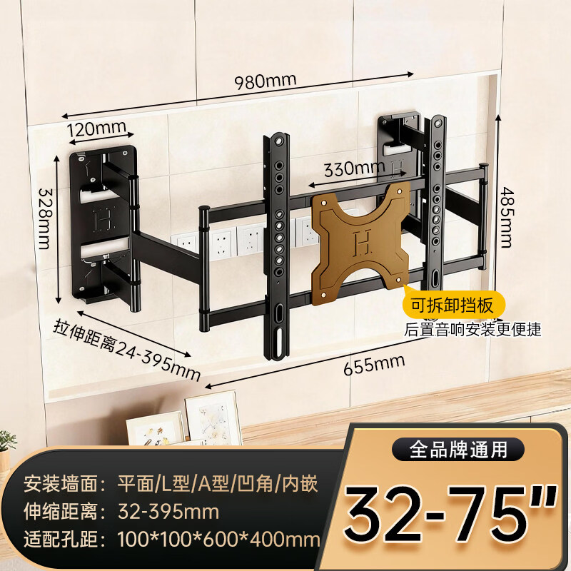 双幼超薄内嵌电视伸缩壁挂架不挡插座音响75/85/98寸小米海信雷鸟通用 32-75寸超强加厚_可微调不挡插座