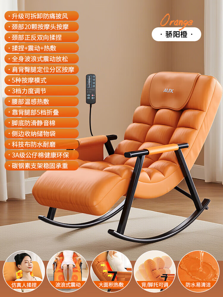奥克斯(AUX)按摩椅全身家用小型折叠懒人沙发休闲智能摇摇躺椅午休神器 【骄阳橙】全身震动按摩+颈腰部热敷