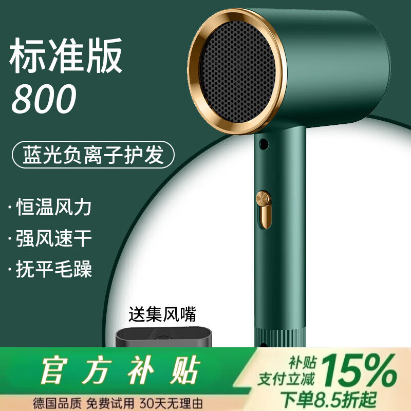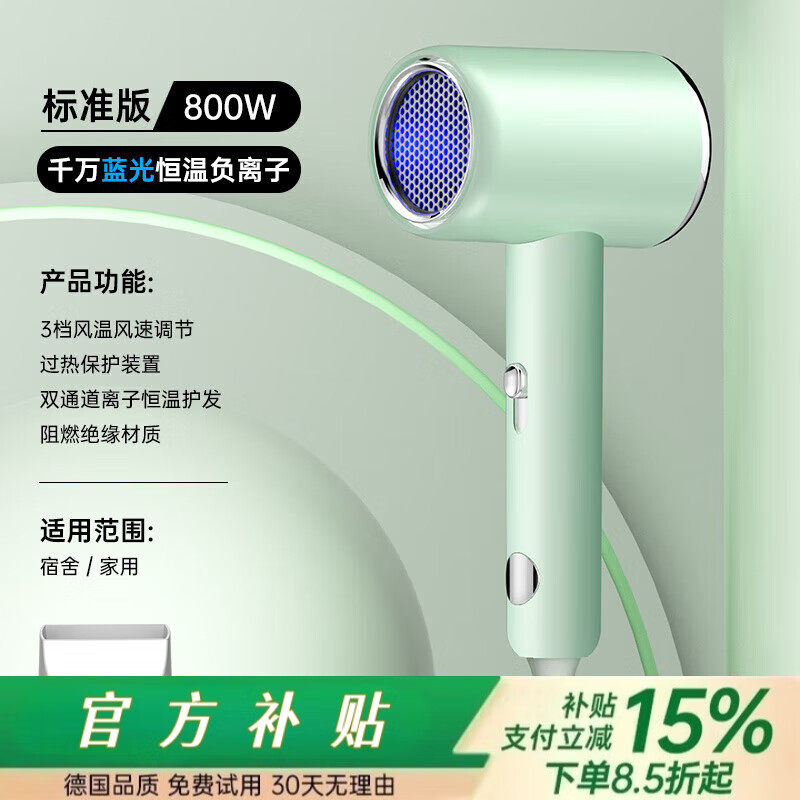 戴森德乐新款网红吹头发吹风机家用大风力电吹风机蓝光负离子护发不伤发学 宿舍版800[绿色]宿舍不跳闸
