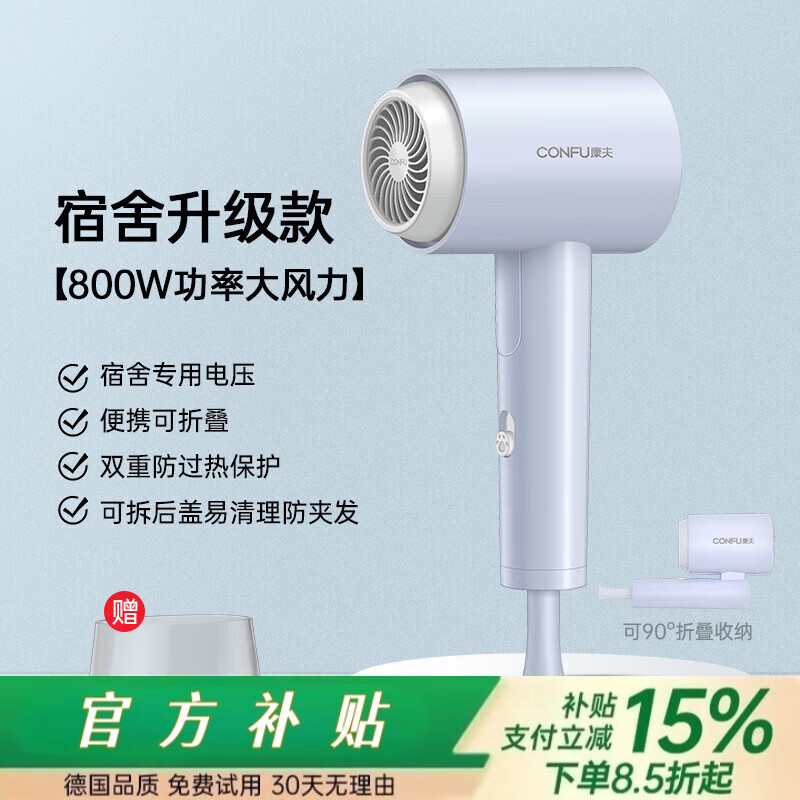 戴森德乐康夫电吹风机家用负离子护发专用大功率速干宿舍用学生可折叠风筒 雾屿蓝800W宿舍专用