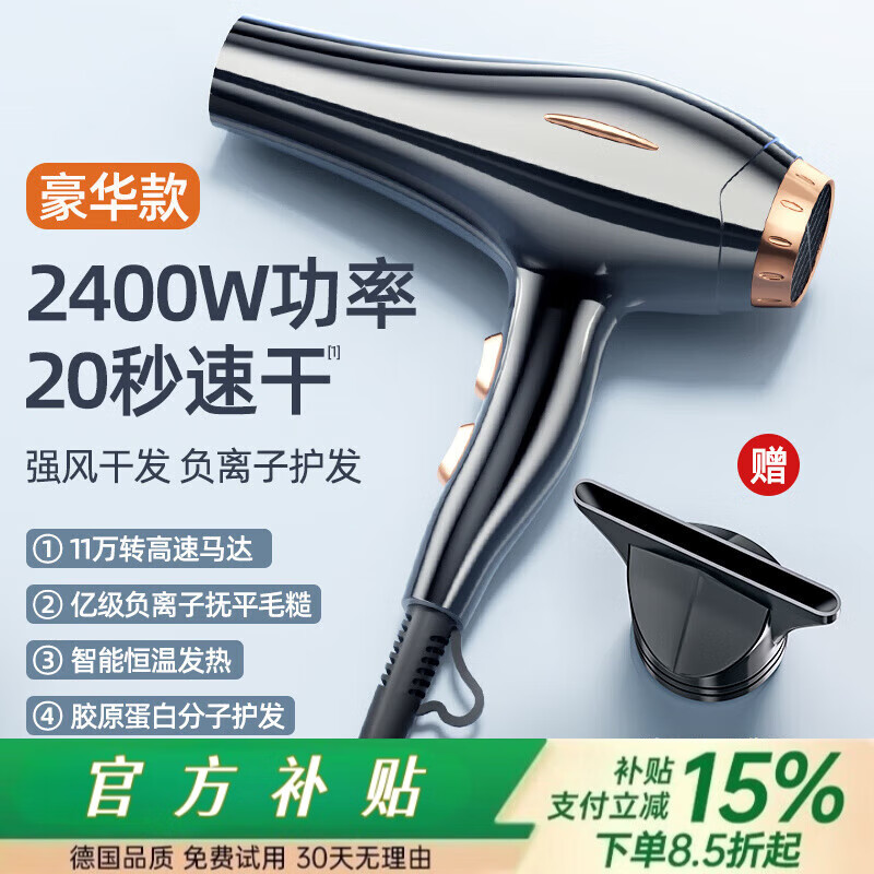 戴森德乐家用学生宿舍吹风机负离子护发大风力速干小功率800W吹风 金奢黑发廊豪华款2400W