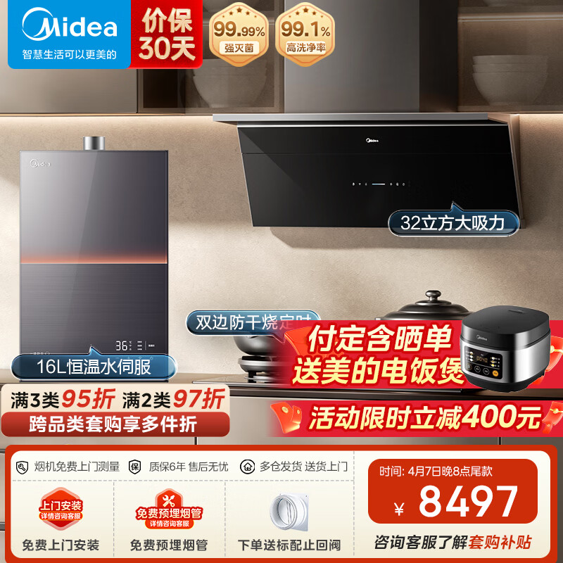 美的(Midea)【小西梅PRO升级版】抽油烟机家用 32风量顶侧一体双风道1500Pa变频大静压自动高温蒸汽洗灶具套装 【烟灶热】32立方+双边防干烧定时灶AK11+16L热水M9MAX