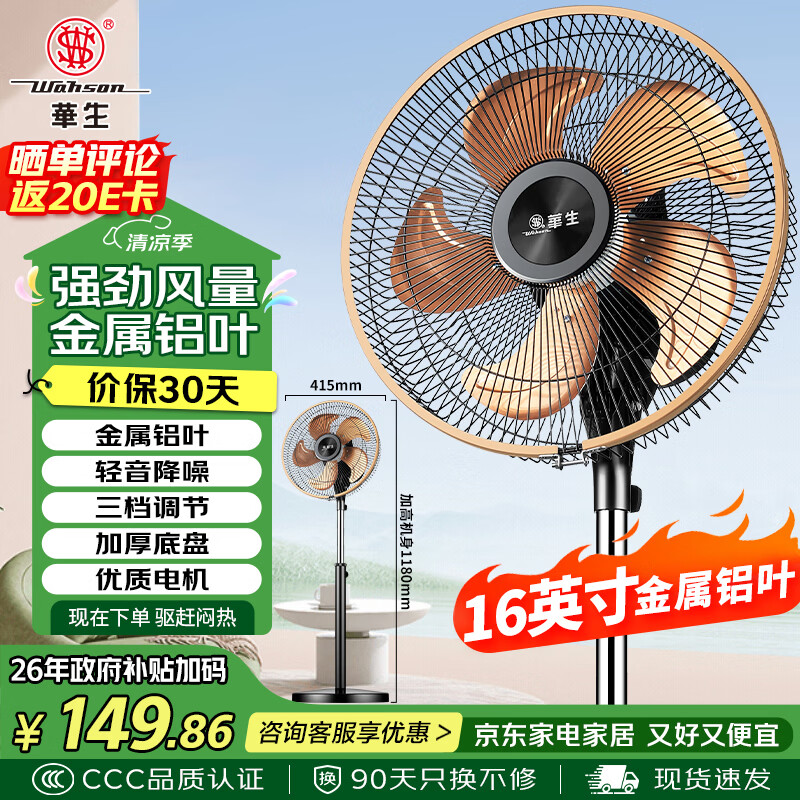 华生(Wahson)电风扇/落地扇/金属铝叶风扇/低噪大风量宿舍办公扇商务家用省电立式电扇FS-D1203