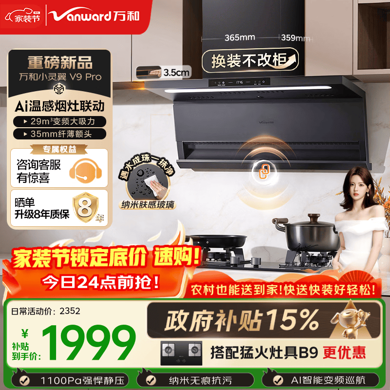 万和【小灵翼V9 Pro·AI烟灶联动】顶侧双吸抽排29风量家用大吸力变频油烟机一级能效以旧换新上门装机
