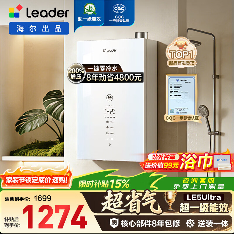 海尔出品Leader统帅超一级能效LE5ULTRA增压一级静音零冷水燃气热水器天然气16升节能恒温wifi智控 16L LE5Ultra【一级能效静音增压零冷水】