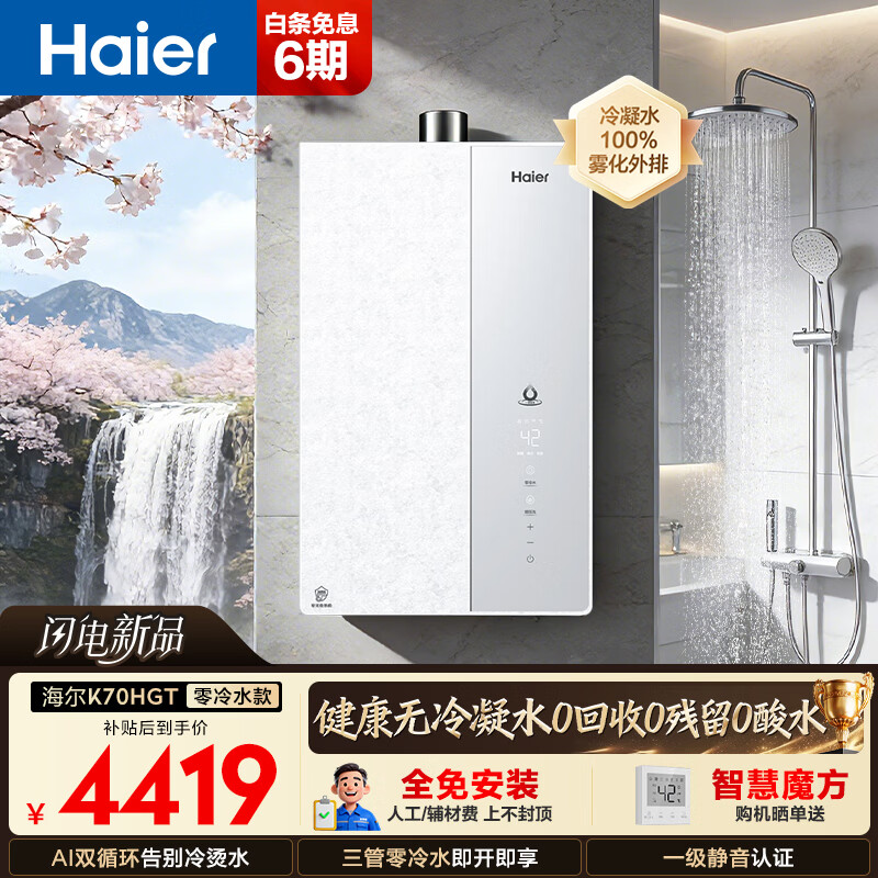 海尔(Haier)麦浪套系燃气热水器K70SMAX无冷凝水管超一级能效超音速离心雾化冷凝水100%外排 16L 下置风机K70HGT【恒温增压零冷水】
