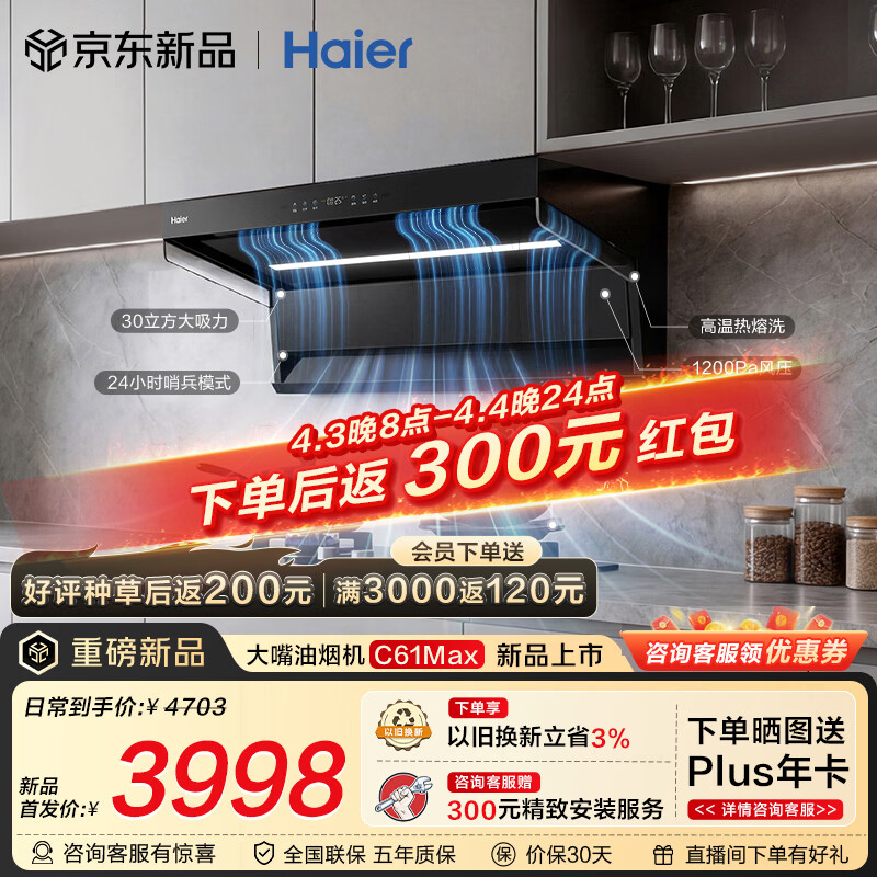海尔(Haier)抽吸排油烟机C61MAX 顶侧双吸家用30风量大吸力热熔洗 上门安装以旧换新搭配防干烧油烟机灶具套装